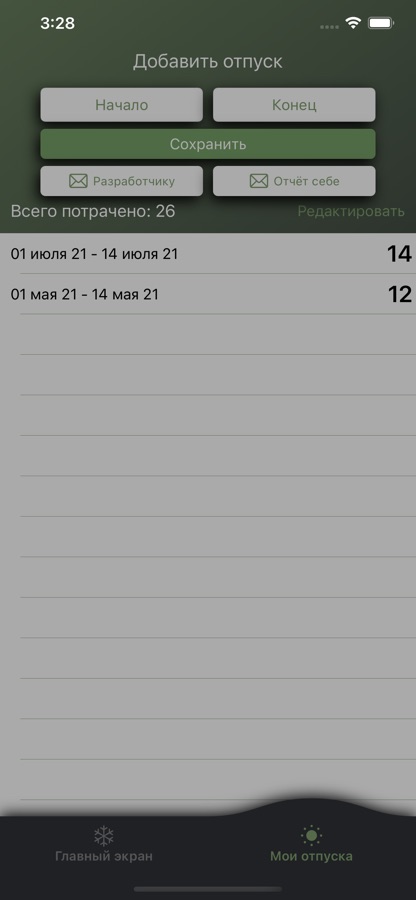 — Можно отправить отчёт об использованных днях отпуска, дате начала работы, дате расчёта, потраченных днях и доступных отпускных днях себе на электронную почту, а также сообщить разработчику о пожеланиях, неисправностях и т. д.