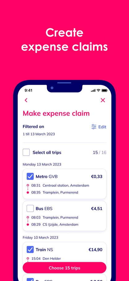 Mag je je reiskosten ergens declareren? Je selecteert in de app de maand en de ritten die je in je overzicht wilt krijgen. De app doet de rest. Je krijgt je overzicht als pdf in je mailbox. Of deel het vanuit de app.