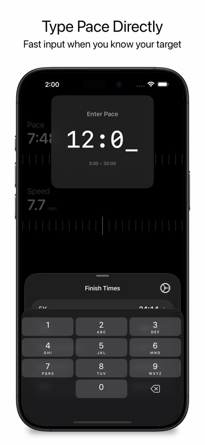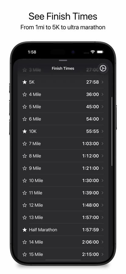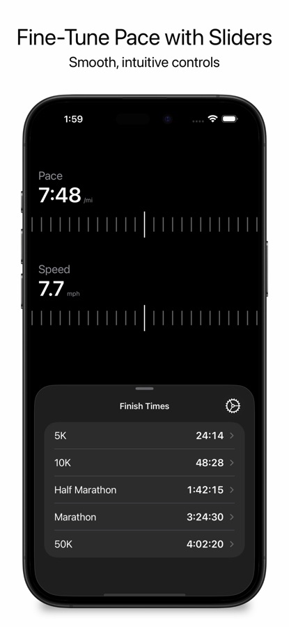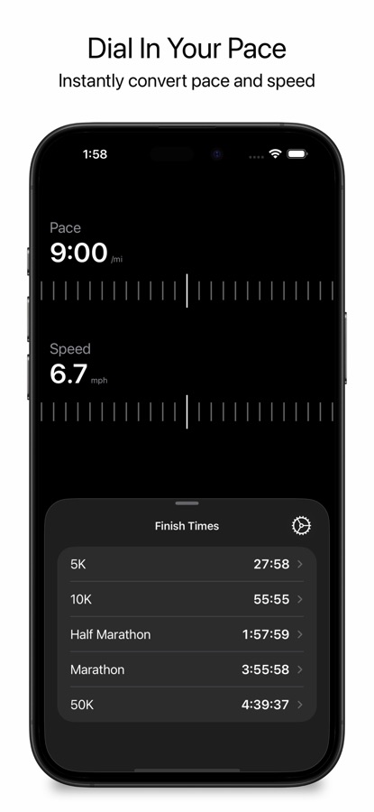 Dial in your target pace or speed and instantly see equivalent values, then view finish times across race distances from short track efforts to ultra marathons.