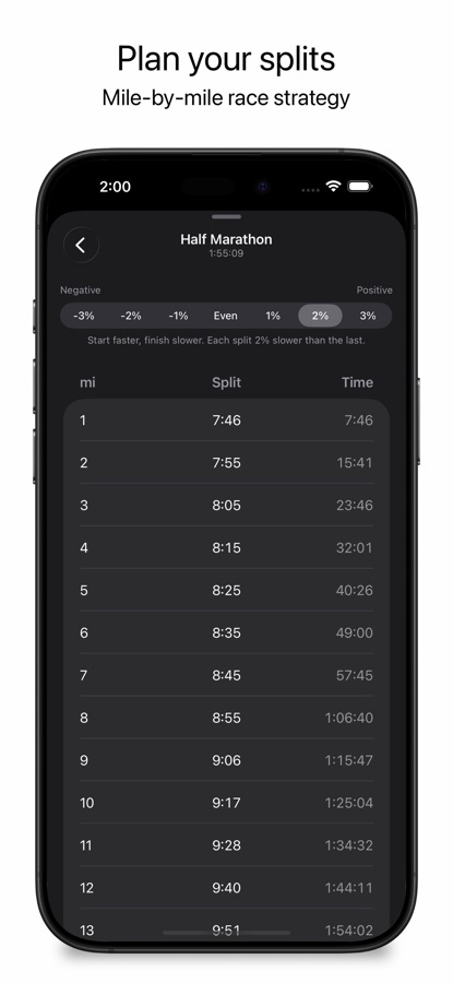 — Plan race strategy with detailed splits (even, negative, or positive)