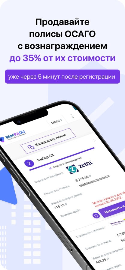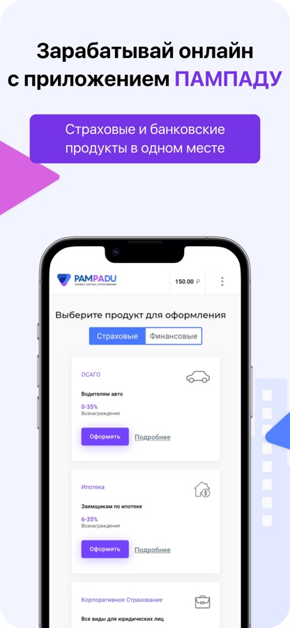 Пампаду — это сервис №1 для агентов, бизнеса, вебмастеров и всех желающих по онлайн заработку на продаже страховых и банковских продуктов.* Помогайте клиентам подбирать и оформлять страховые и банковские продукты, зарабатывая с каждой продажи независимо от вашего опыта: ОСАГО, КАСКО, ипотечное страхование, кредитные, дебетовые карты, вклады, ипотека, МФО, РКО, кредиты наличными, микрозаймы, а также на подборе персонала. Доступно уже через 5 минут после установки приложения. Быстрая выплата вознаграждения на карту или счет.