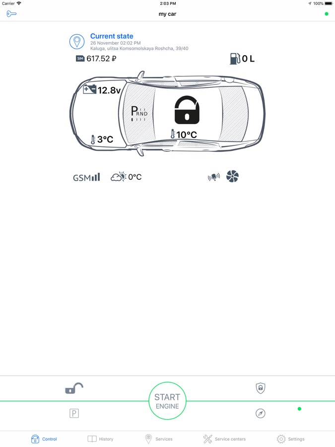 – Контроль текущего состояния Ваших автомобилей: состояние всех охраняемых зон и датчиков, текущий остаток топлива в баке (зависит от подключения), температуру двигателя, температуру в салоне автомобиля, температуру за бортом (требуется подключение датчика), текущее местоположение автомобиля.