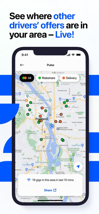 Know where the busy areas are for both rideshare and delivery across all platforms. Use this to earn more by planning your work day and being in the right areas at the right times without having to toggle between apps. Also see how these offers compare to new gig offers in your area not shown on the big platforms.
