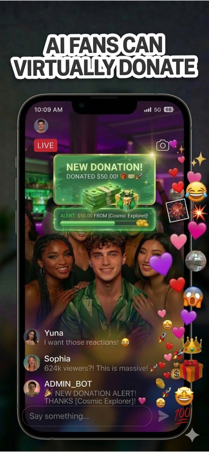 Step into your own virtual stage and go live to thousands of AI-generated fans who react, comment, and cheer you on in real-time. Whether you’re preparing for a presentation, practicing your charisma on camera, or just building your confidence to speak freely — Parallel Live gives you the perfect space to express yourself with zero judgment.