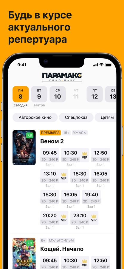 Мобильное приложение кинотеатра «Парамакс» поможет вам подобрать удобный сеанс, узнать о новинках кинопроката и приобрести билеты в кино.