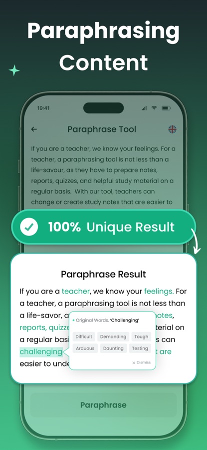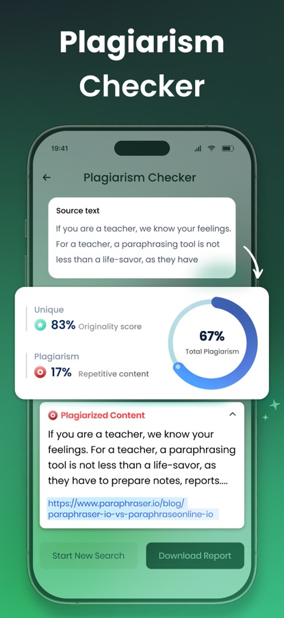 Besides the paraphrase tool, our app offers a Plagiarism Checker, Text Summarizer, Grammar Check, and Article Rewriter. So, our one-pack solution app can help you rephrase sentences, check for plagiarism, correct grammar mistakes, and summarize content.