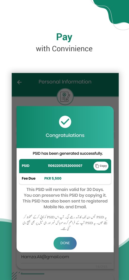 User(s) can Calculate Passport Fee with simple & easy Wizard to choose suitable options as per his/her own travel requirements and generate Payment Challan (PSID). This PSID can be paid instantly via ATM, Internet-Banking, payment over the counters (POC) or 1-link member bank branches .
