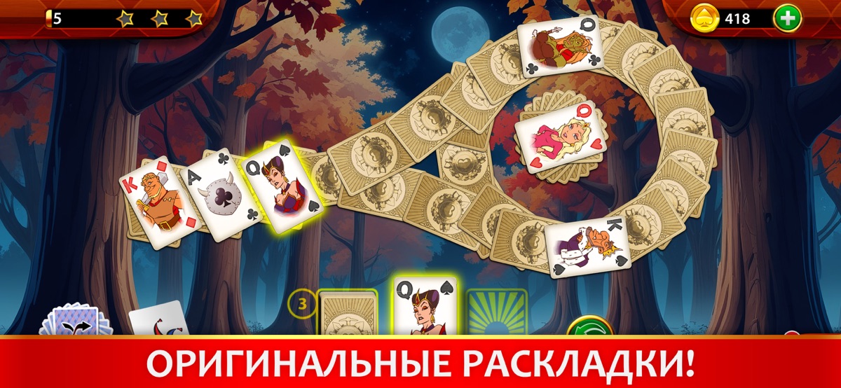 Совершенно новый пасьянс! Снимайте подходящие карты чтобы очистить стол, получайте ценные призы, соревнуйтесь с друзьями. И никакой спешки.