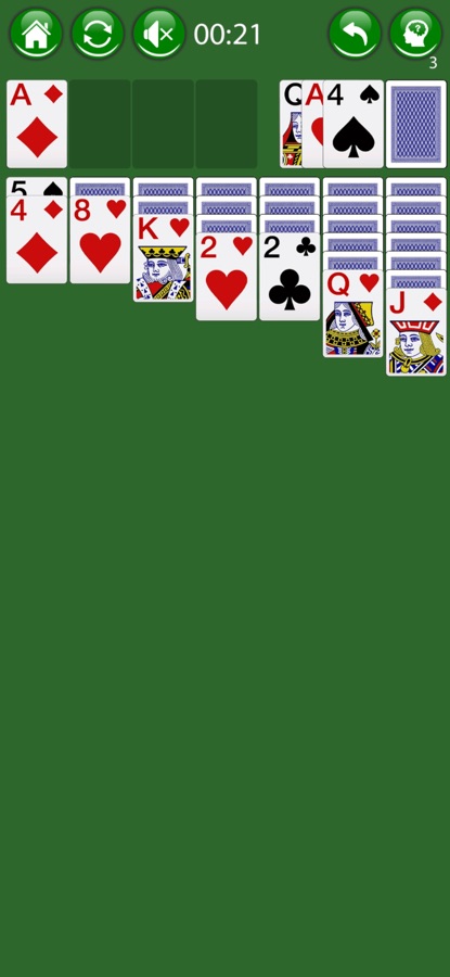 В каждую базу первым кладется туз, затем двойка, далее тройка и так далее до короля. Карты можно брать из оставшейся колоды, в простом уровне сложности по одной, а в сложно уровне по три сразу. На свободные ячейки (не в базе) можно положить только королей. Игра считается пройденной, когда разложены все карты пасьянса по базам.