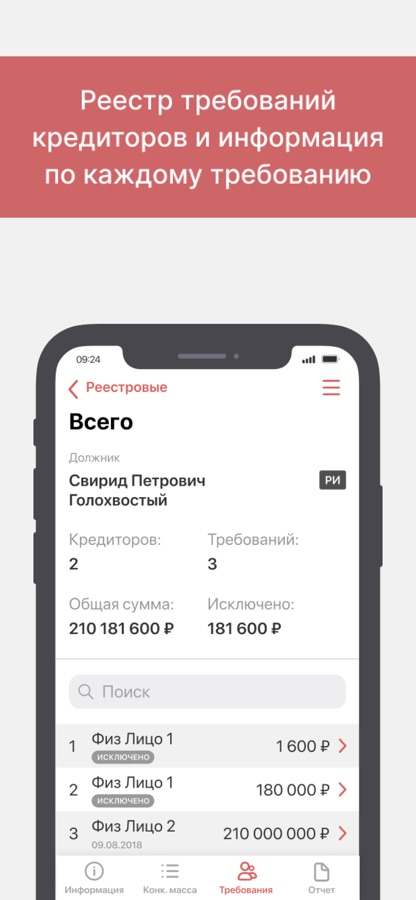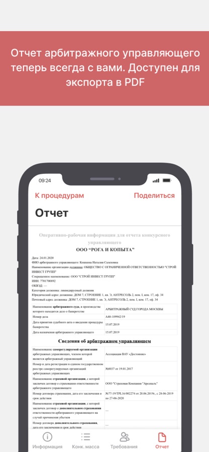 Установив приложение, арбитражный управляющий, его команда и наблюдатели (кредиторы, ФНС и прочие заинтересованные лица), смогут в любой момент ознакомиться с данными по процедуре банкротства.