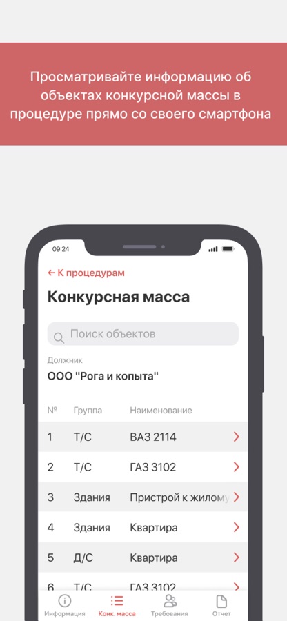 — Конкурсная масса с отображением объектов конкурсной массы;