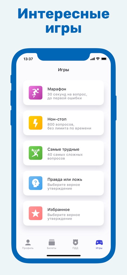 — Режим экзамена также разнообразен: самый простой, когда вопросы выбираются случайным образом из всех; сложный, когда вопросы выбираются из тех, в которых вы совершали ошибки; самый сложный — марафон, когда вы должны ответить на все вопросы из всех билетов