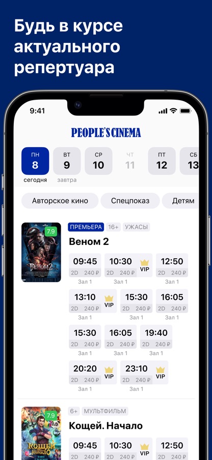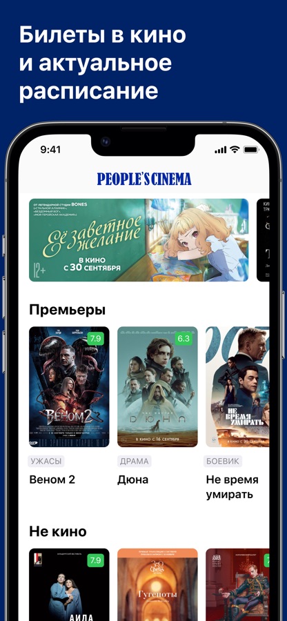 Мобильное приложение кинотеатра «People’s Cinema» поможет вам подобрать удобный сеанс, узнать о новинках кинопроката и приобрести билеты в кино.