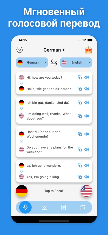 Говорите и переводите немецкий на более чем 100 языков — идеально для живых разговоров и путешествий.