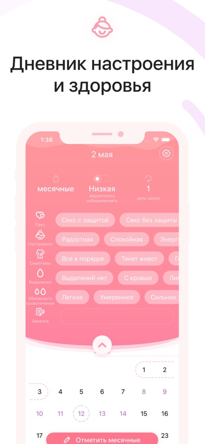 Кроме отслеживания цикла вы можете записывать дополнительную информацию о себе. Добавляйте важные события, связанные с интимной жизнью. Также можно добавлять настроение, симптомы или заметки. И таким образом приложение станет вашим личным дневником.
