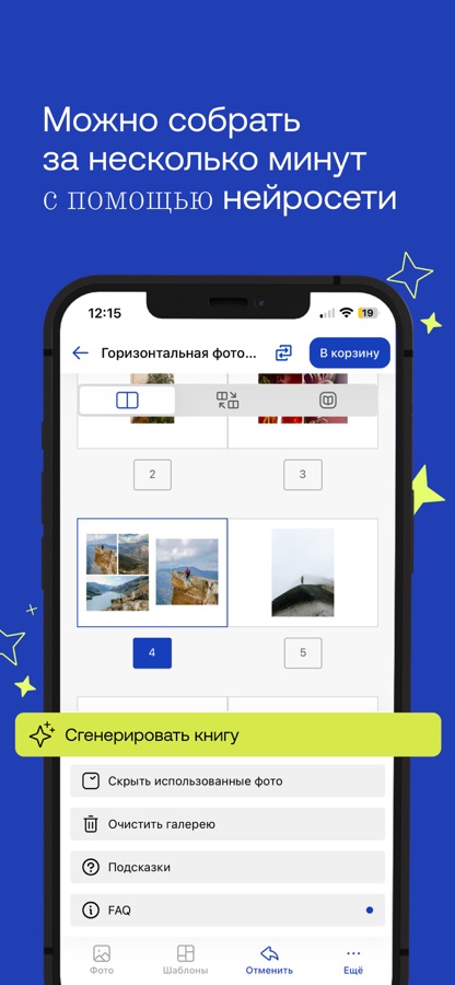 — возможность сгенерировать фотокнигу с помощью нейросети — искусственный интеллект отберет лучшие фото и расставит их на страницах.