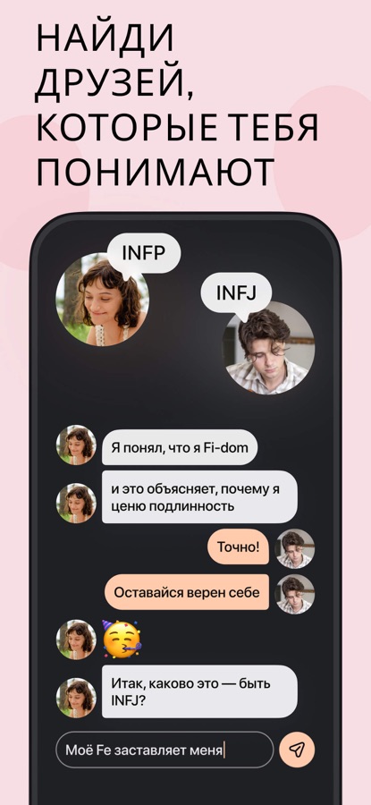 ● Самая большая база типологий в мире — конкурентов просто нет. Более 2 миллионов профилей, и список растет каждый день. ● Создано для тех, кто привык думать глубоко. Честные дискуссии о росте, отношениях и вещах, которые действительно важны. ● Комьюнити, где ты дома. Интроверты, эмпаты и исследователи со всех уголков планеты. ● Премиум-инсайты для тех, кто хочет докопаться до сути: тонкости совместимости и детальный разбор твоего типа. ● Постоянные обновления: новые фичи, персонажи и способы найти людей, которые тебя наконец-то поймут.