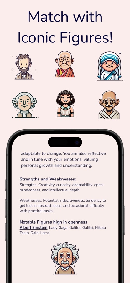 Our app doesn’t stop at analyzing your traits. You’ll also discover notable figures and personas who share your unique profile! By learning about famous people who align with your Big Five traits, you can gain deeper insight into how you might approach challenges, opportunities, and relationships.