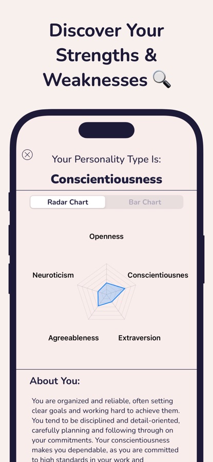 Curious about your personality? Ready to unlock insights about your character traits and uncover hidden strengths? With the Quick Personality Test BigFive app, you can dive into the world of personality psychology and find out where you stand among the Big Five personality traits! In just five minutes, this quick and engaging personality test will give you a detailed profile based on scientifically-backed traits used worldwide.