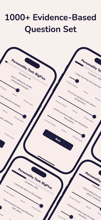The Big Five Personality Test presented in this app is based on the Five-Factor Model of personality, a widely studied framework in psychological research. However, the results provided are not a substitute for professional psychological assessment, diagnosis, or treatment.