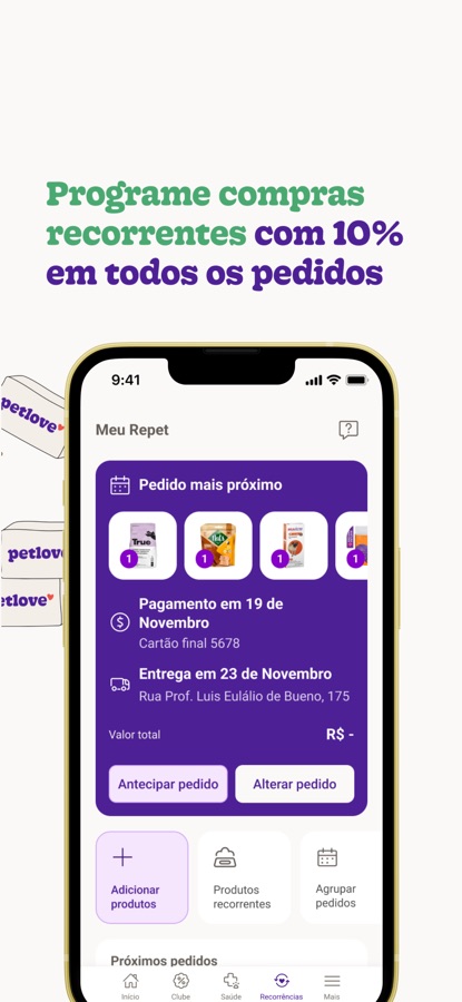 Pelo app você confere quais são suas recorrências, edita os produtos e pode alterar a data de recebimento. Tudo isso de graça, sem taxa de cancelamento e ainda com benefício de 10% de desconto em todas as suas compras. Incrível, né?