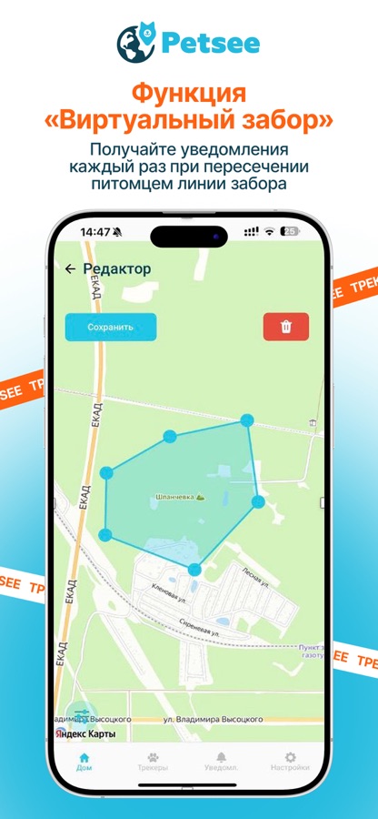 Виртуальный забор (геозоны) — задайте безопасную территорию, и как только питомец её покинет, получите моментальное уведомление.