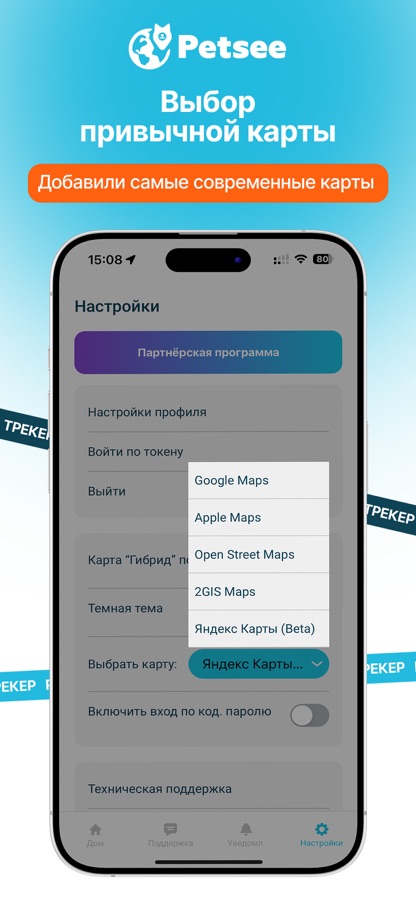 Что умеет Petsee: онлайн-карта в реальном времени — смотрите перемещение питомца на привычных картах: Яндекс Карты, 2ГИС, Google, OpenStreetMap и Apple Maps. Радиус действия не ограничен — нужен только интернет.