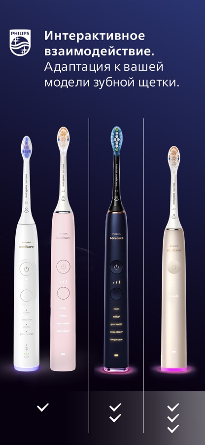 – DiamondClean Smart и FlexCare Platinum Connected — карта полости рта с определением положения щетки и уведомлениями о пропущенных участках.