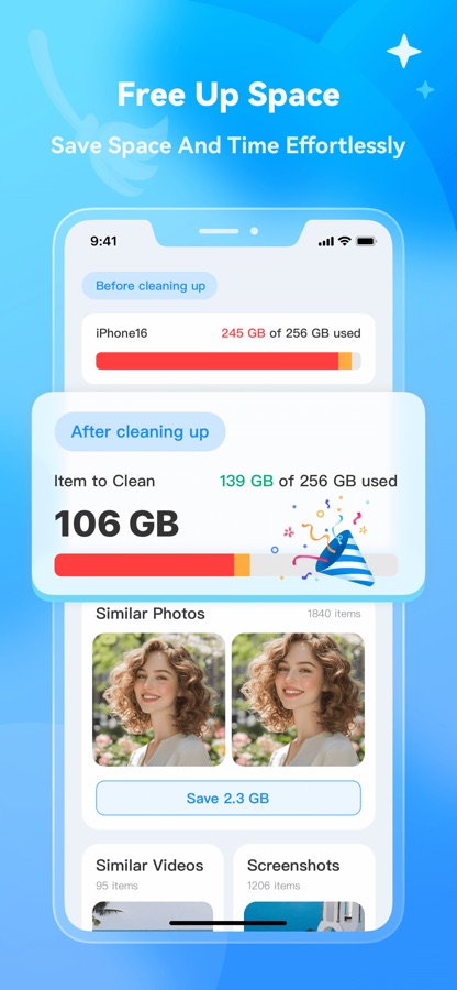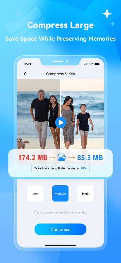 Save space by compressing photos and videos without compromising quality, optimizing storage for new memories.