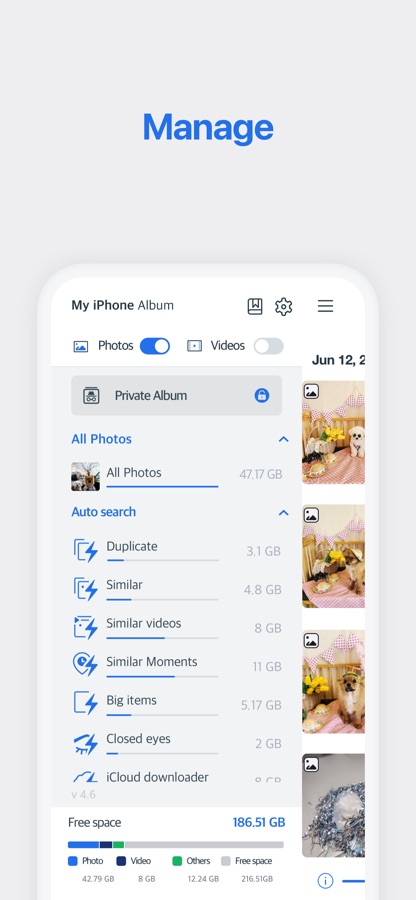 — Категории автопоиска: Наш собственный алгоритм автоматически обнаруживает дубликаты, похожие фото/видео, большие файлы, снимки с морганием/закрытыми глазами и медиа низкого разрешения. Начните с удаления дубликатов, чтобы быстро освободить гигабайты.