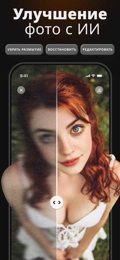 Делайте размытые портреты, селфи и групповые снимки кристально четкими. Искусственный интеллект полностью восстанавливает фото, повышает детализацию лица и убирает размытость одним касанием. Даже фото в движении или ночные кадры становятся значительно четче.