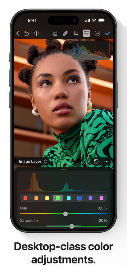 • Photomator is built from the ground up for iPhone and iPad with a native design that blends seamlessly with the sleek and modern look of iOS and iPadOS 18