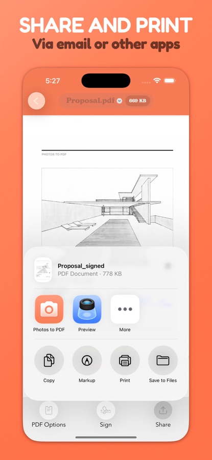 Export and share all your PDF documents right from the app with a single tap. Send via iMessage, Open in other apps, Print, etc.