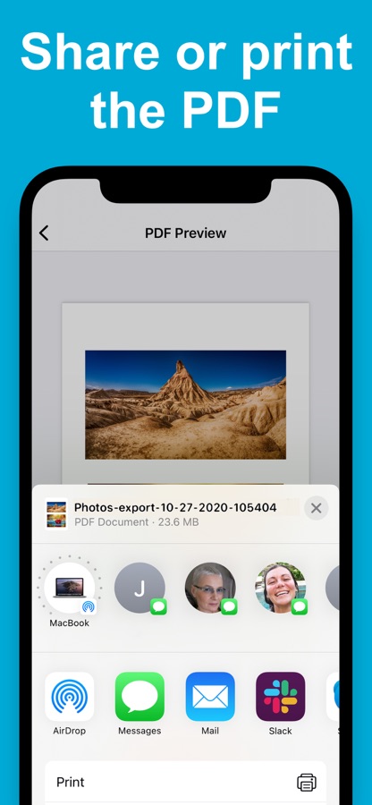 Quickly and easily convert your photos to PDF and share them with you friends and family in no time. Choose your layout, margin, page orientation, and paper size, then preview your PDF photo album before saving, sharing, or printing it.