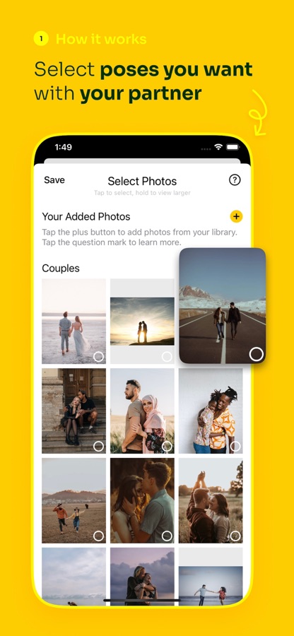 Plan out your photo shoot by selecting from our library of poses or uploading your own. The poses are shown overlaid onto the camera preview so everyone in the photo knows how to position themselves. This helps everyone get on the same page and can be a great starting point for making the shoot your own.