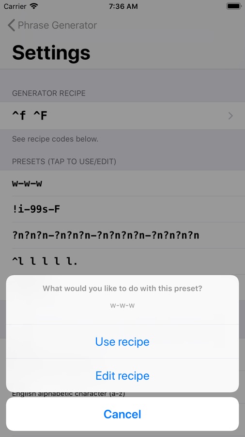 Creating random passphrases and passwords according to strange rules can be frustrating. Phrase Gen will allow you to write your own recipes to generate to whatever format you need using simple codes.