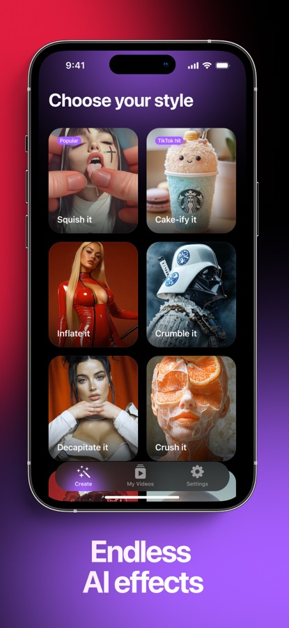 Choose an Effect: Pick from exciting effects like Explode, Melt, Crush, Cake-ify, Inflate, or Squish, and animate your image with AI precision.