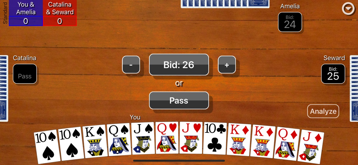 An analyze button can be turned on to help you evaluate your hand and pick a smart bid by simulating thousands of games and showing you likely round score outcomes. A hint button can be turned on to help you see what card the computer Pro player would play in your situation. Extensive statistics are kept for wins/losses, average contract, average meld, and average counters and success rate in making your bid.