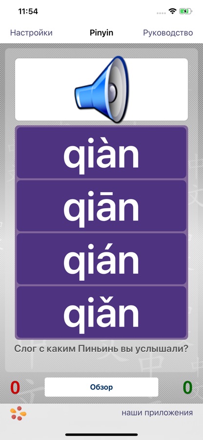 — Возможность тренировать тоны и инициали слогов Пиньинь позволит вам научиться различать слова, которые чаще всего путают