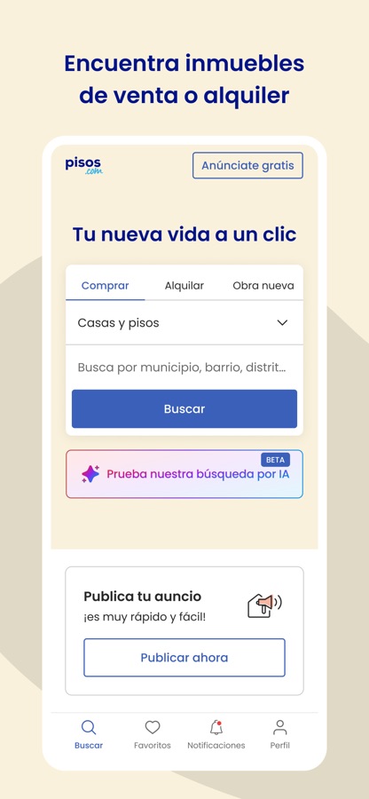 Con la app de pisos.com es así de fácil. Dinos qué buscas exactamente y nosotros te avisamos de nuevos anuncios de tu interés. ¡Serás el primero en enterarte!