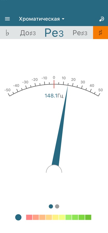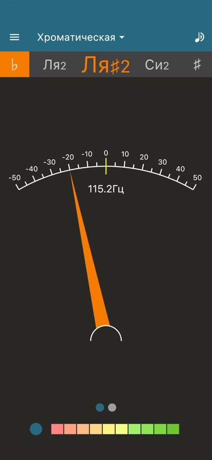 Pitched Tюнер отображает традиционную иглу тюнера и набор. Он четко показывает воспроизводимую частоту, а также ближайшую ноту и ошибку в центах. Затем циферблат позволяет легко отслеживать небольшие изменения высоты тона. Отдельный индикатор громкости говорит вам, насколько четко микрофон подбирает звук вашего инструмента.