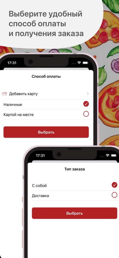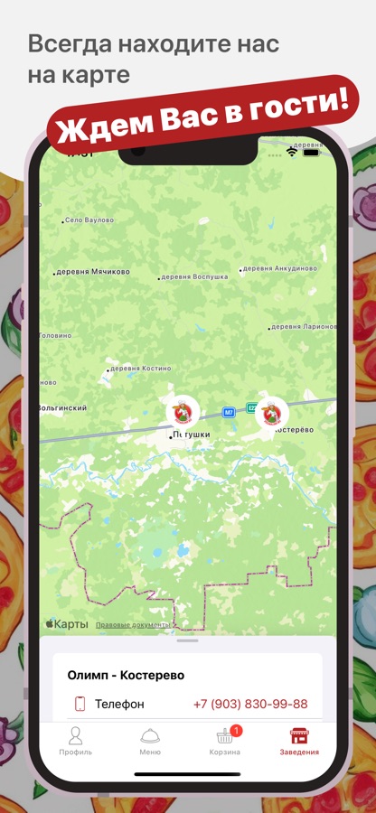 Как сделать заказ в приложении “Пицца Олимп”: выберите понравившиеся позиции из меню, добавьте их в корзину и перейдите на экран оформления заказа (по нажатию на иконку корзины).