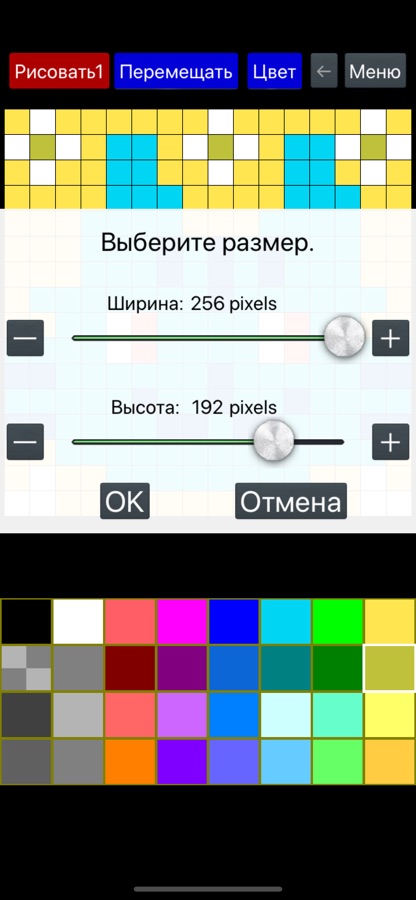 — Рисование на холстах от 1×1 до 256×256 пикселей.