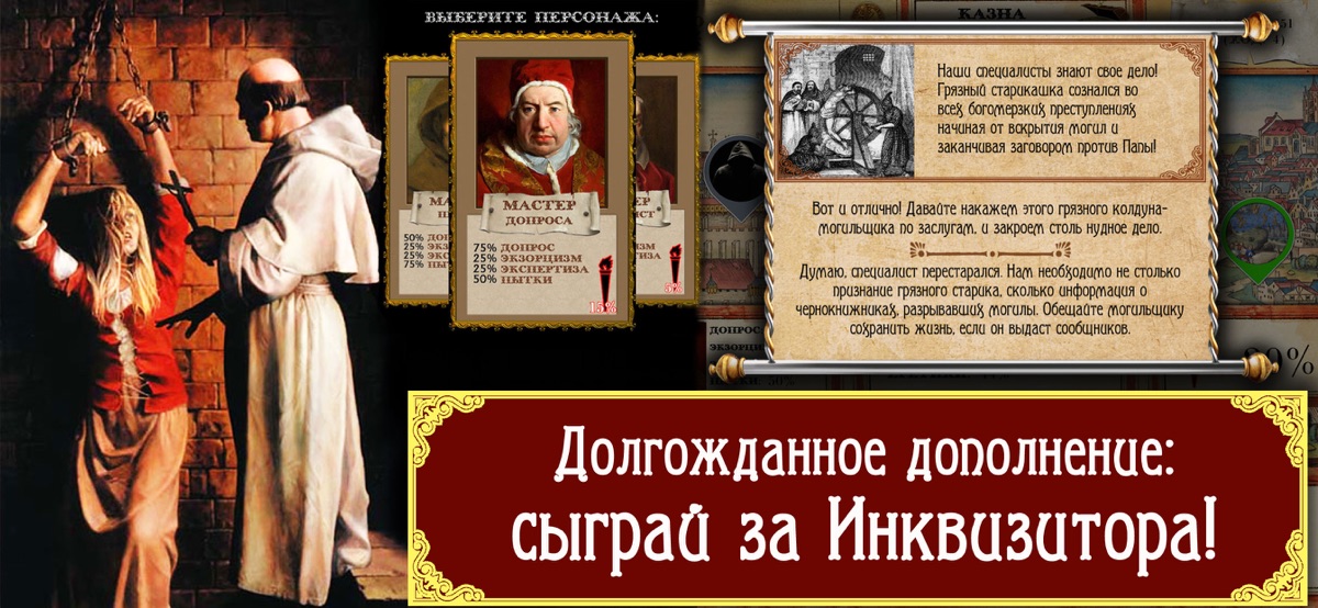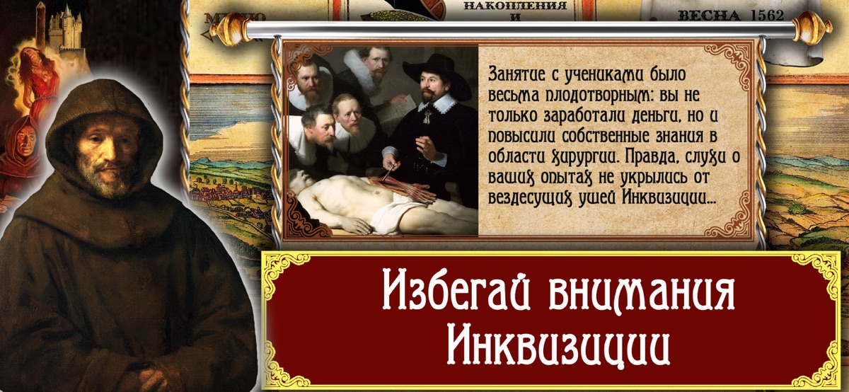 +++ Вкладывай заработанные монеты в постройки медицинских учреждений, покупку научных трактатов или трать их на взятки инквизиторам.
