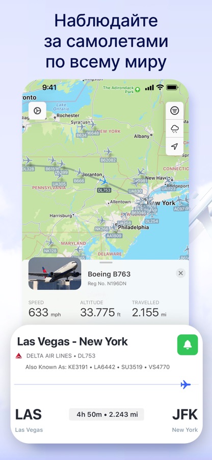 * Наблюдайте за полетами самолетов и бипланов в режиме онлайн по всему миру