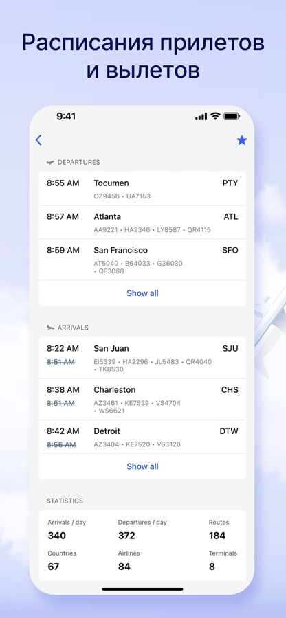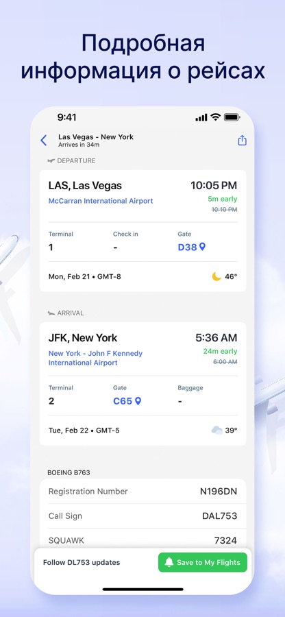 * Получайте уведомления об изменениях в расписании рейсов: будьте в курсе статуса рейса, отмененных полетах, информации о времени прилета и вылета самолета и др.