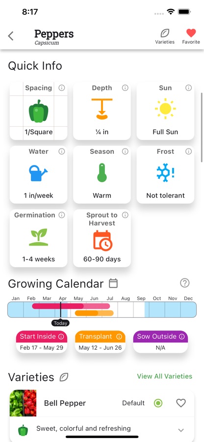 • Planting calendar for when to start seeds or transplant