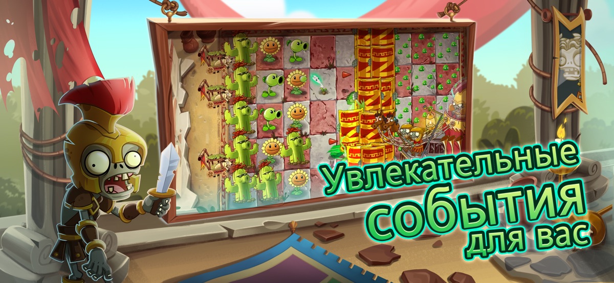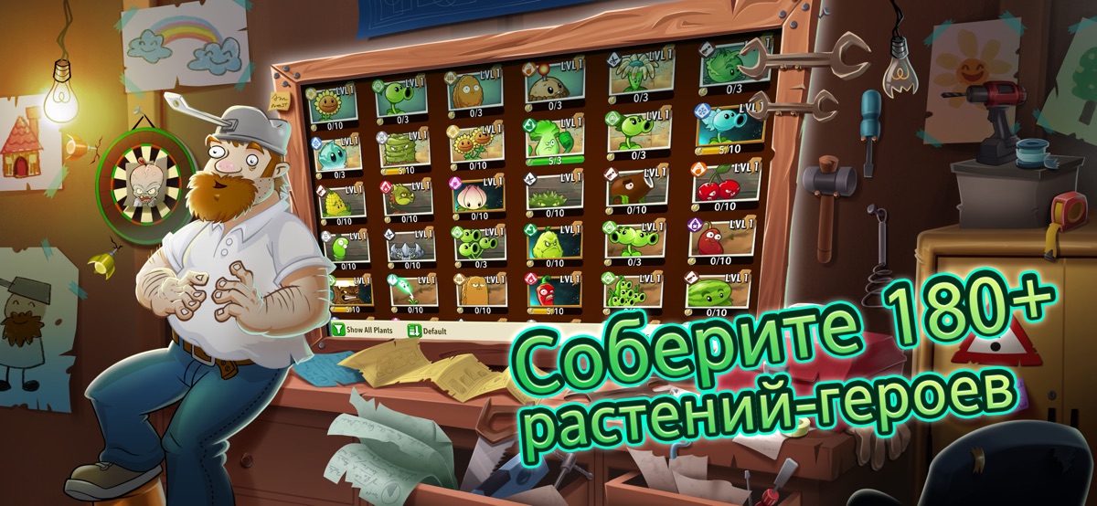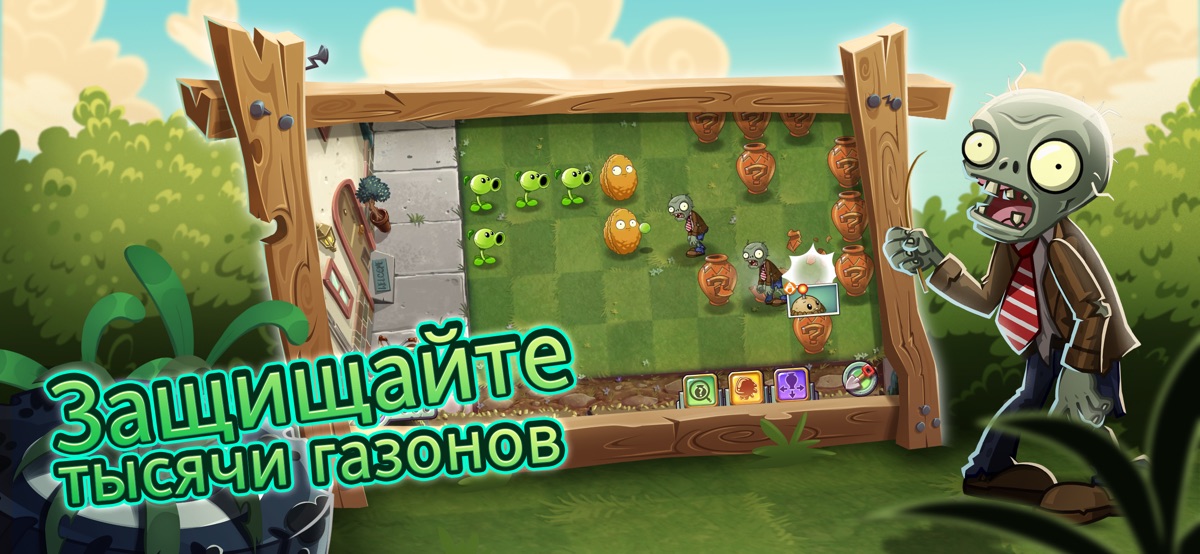 Собирайте легенд газона, вроде Подсолнуха и Горохострела, а также обжигающих и бесстрашных Гуаву, Лазерного боба и других растений. Защищайте свой газон от полчищ живых мертвецов вроде Зомби с ранцем, Бесенка-русаленка и даже безумных Зомби-куриц.