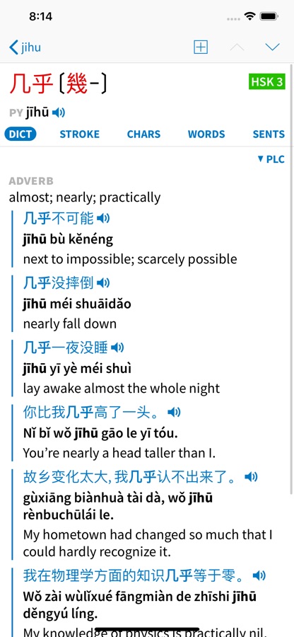 • PRC/HK/Taiwan-friendly: every part of Pleco supports both traditional and simplified, headword readings can be shown in Pinyin and Zhuyin, and some dictionaries even support Cantonese. (note: stroke order diagrams do support traditional characters, but use PRC order)