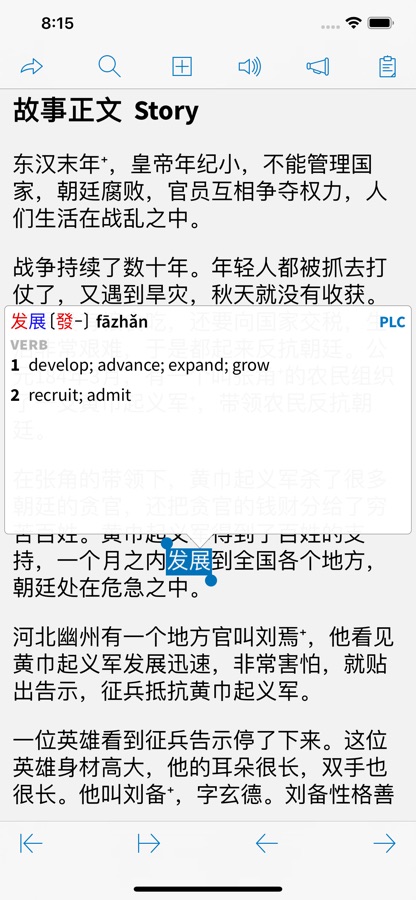 • Amazing dictionaries. We offer two free built-in dictionaries: the popular open-source CC-CEDICT, with over 110,000 frequently-updated entries, and our own PLC dictionary, with 125,000 entries, parts of speech, and over 25,000 example sentences (with Pinyin). More than two dozen other dictionaries are available as free and paid ($) add-ons, including licensed titles from well-known publishers like Oxford, Longman, FLTRP, Tuttle, SLPH, and Commercial Press.